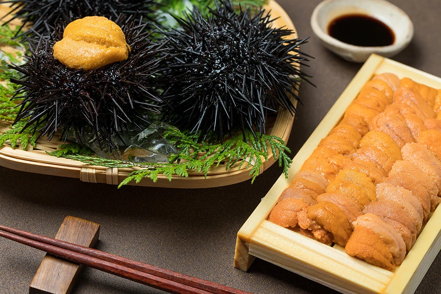 ミョウバンの使用を最小限にした、塩水に浸して鮮度を保ったウニ。自然な甘みと濃厚な旨みを、そのままお楽しみいただけます。